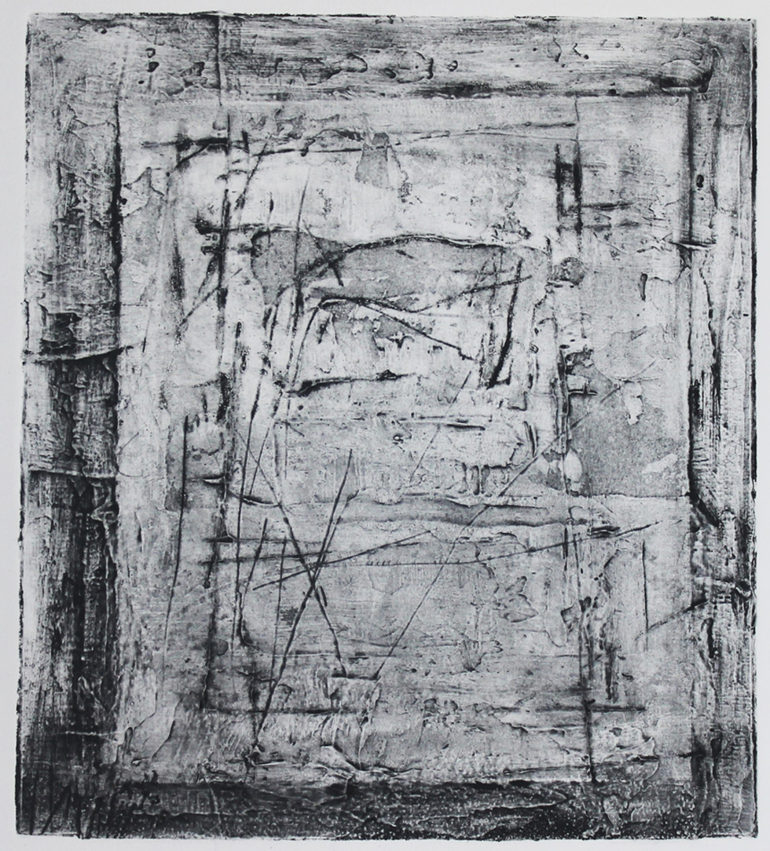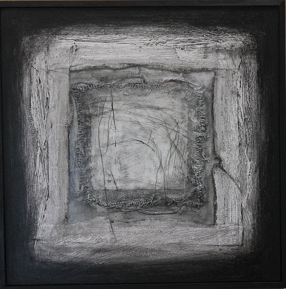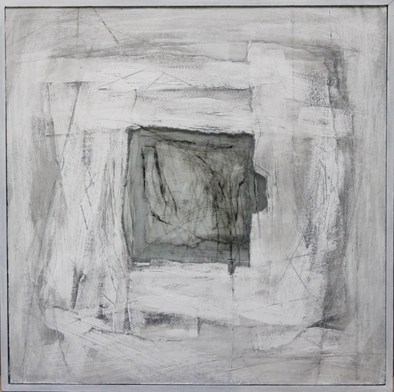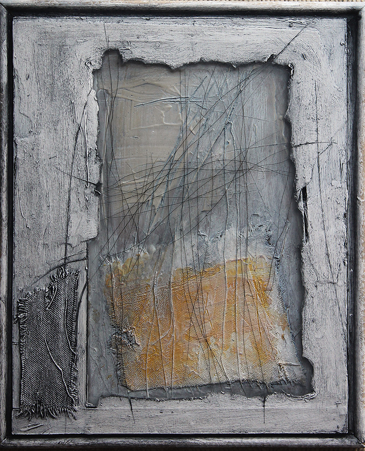Paper, acrylic, impasto, scratched and engraved glass (inset) on board